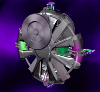 環缸式圓形轉子發動機的氣缸為中空圓輪環形,異形連桿斷面呈“S”形,氣缸通過左右氣缸座、軸承與中央軸連接呈游離狀態,異形連桿也通過一對軸承與左右汽缸座固定呈游離狀態,右氣缸座上固定有中空傳動輪,輪內設置有行星齒輪與凸輪機構